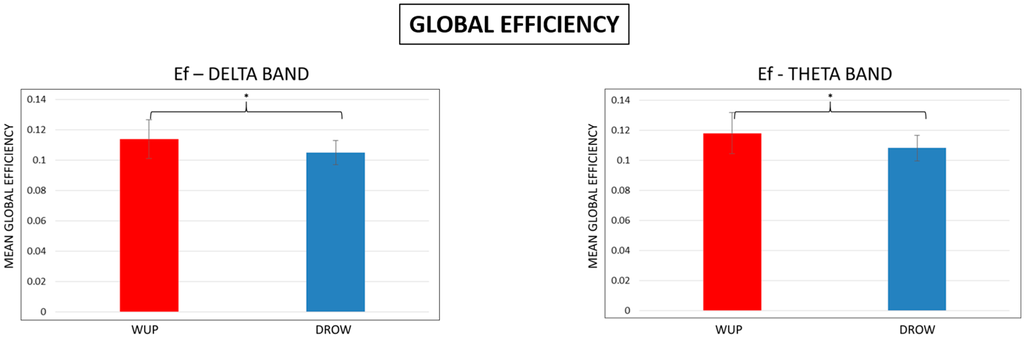 Figure 7. Mean Global Efficiency (Eg) in the delta and theta bands. Note that the Eg estimated for the DROWSY condition was significantly (p < 0.05) lower than the Eg in WUP.