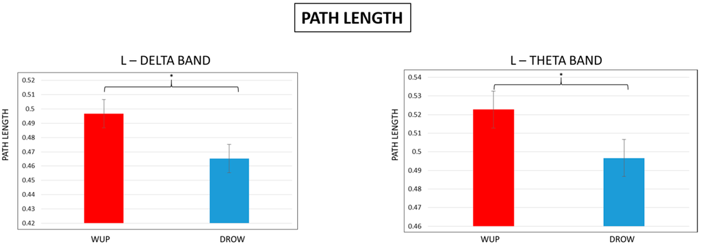 Figure 8. Mean Path Length (L) values in the delta and theta bands. Note that the L estimated for the DROWSY condition was significantly (p < 0.05) lower than the L in WUP.