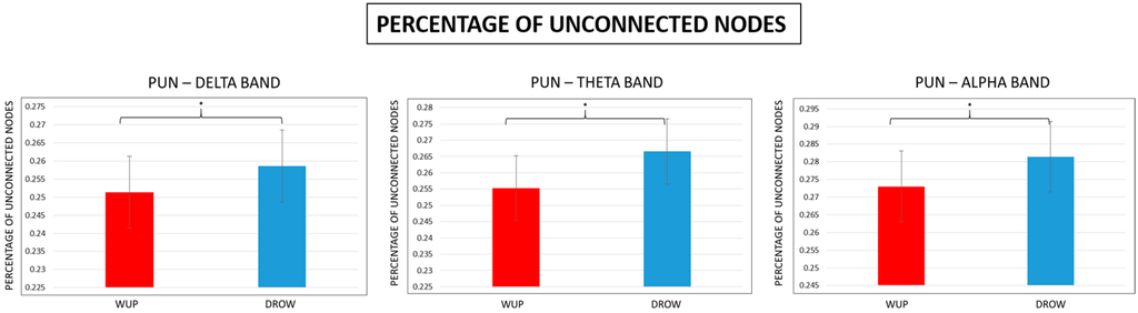 Figure 9. Mean Percentage of Unconnected Nodes (PUN) values in the delta, theta and alpha bands. Note that the PUN estimated for the DROWSY condition was significantly (p < 0.05) higher than the PUN in WUP.