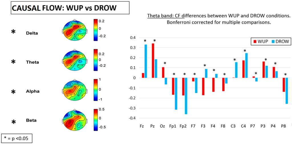 Figure 10 shows the difference between the WUP and DROW conditions in terms of Casual Flow (CF) over the different EEG channels. In particular, on the right side of the figure, the mean CF values in the theta band are reported as representative of the other bands. In fact, significant differences (p < 0.05) have been found in all the considered EEG bands. The results show that from WUP to DROW condition, a significant reduction of the CF was found over the prefrontal (Fp1 and Fp2) and parietal (P3, P4, P7 and P8) lobes and in the posterior midline (Pz and Oz). On the contrary, significant CF increases were found on the frontal (Fz, F3, F4 and F8) and central (C3 and C4) lobes.