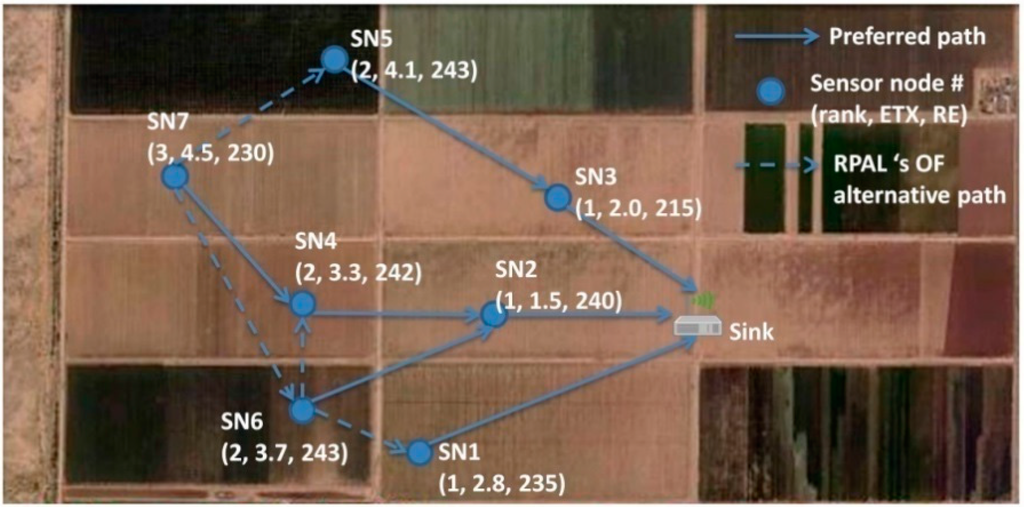 One A-LLN with seven sensor nodes and one sink is located as shown in Figure 1 where the A-LLN nodes are equipped with agricultural sensors, periodically send monitoring data to the sink. We firstly assume that this is a stable network and the links are symmetric. Only SN1, SN2 and SN3 are in the radio range of the sink and can forward the messages from the other four nodes. Each node has three attributes: Rank, link ETX, and RE. If MrhOF and ETX metrics are used to build routing paths to the sink, SN4, SN6 and SN7 will choose SN2 as their best parent due to its lowest ETX. Consequently, SN2 will deplete its energy faster and become inactive, and the network cannot respond properly to subsequent messages. To overcome this hotspot issue, the RPAL OF algorithm takes the available energy into account. Namely, two routing metrics, ETX and RE of each node are used to compute the best path to the sink. Here is the principle of preferred parent selection: each node chooses its forwarders from its neighbors which have feasible links to the sink. Then from this subset, two nodes having maximum RE are selected to become the best and backup parents of this node. Maximum path residual energy calculation like ELR and MMBCR [63] is used in RPAL OF. Essentially, this metric can avoid the routes traversing the nodes which have the least battery capacity among all possible routes [64].