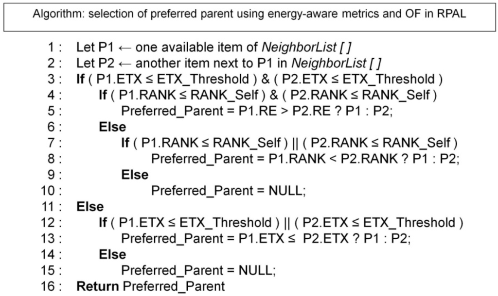 Figure 2 presents the RPAL OF algorithm that is also an extension based on the ContikiRPL OF [65]. It assumes there are at least two neighbors/parent candidates for this router/leaf node. The parameters ETX_Threshold and RE_Threshold are re-configurable and dependent on A-LLN’s application. The ETX_Threshold represents the maximum level of ETX value considered as a best parent candidate. It is pertinent to packet E2ED, and depends on the application QoS requirements. The RE_Threshold is the minimum difference of RE for a node to trigger the best parent switch. These two values introduce a configurable level of hysteresis in order to conduct the preferred parents updating, so RPAL OF could be configurable for the specific PA application. The algorithm can repeatedly search for the node with the highest least energy node routing path among all the routes with minimum ETX. Finally, to avoid loops, each node rules out the neighbors with greater rank from being its optional parents.