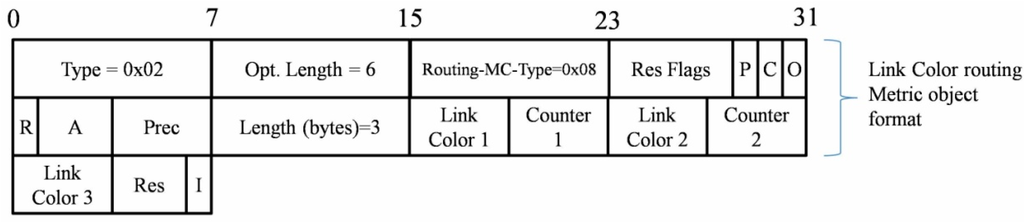 Link color routing metric is an efficient metric to disseminate the link quality information. In particular, we note that research about this metric was quite scarce before the drafting of this article. As the ETX metric has been adopted as a link quality indicator, the link color metric container can give three new defined routing metrics a piggyback. In Figure 3, the format of this container using a cumulative color counter is depicted, and the utilization of each Link Color flag field is depicted in Table 4.