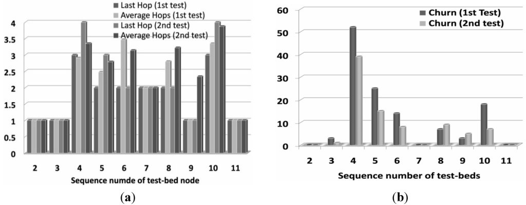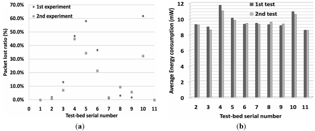 In Figure 8a, for nodes with an average hop count from the sink node lower than two, there was almost no packet loss detected. This is the effect of configuring with four retransmissions and the existing line of sight propagation. Notice that when the hop count equals to three, the packet loss increases significantly. On the one hand, low packet delivery is caused by the bad link quality of intermediate nodes. For example, monitoring packets from node 5 and 10 have to transverse the optional parents 4, 3 or 6, but node 4 keeps rejoining the DODAG network and this also leads to frequent disconnections when it serves as parent. This causes higher packet loss for nodes 5 and 10 in the 1st experiment than in the 2nd one. Besides, the statistical results also count the part of the packet loss if node 3 and 6 are dead before the end of these two tests. As the SCAOF algorithm has the ability to adapt the network topology to avoid nodes 3 and 6 as busy routers, the results indicate that these two nodes lose fewer packets in the 2nd test. Notice that nodes 8 and 9 have more network churns in the 2nd test and they have more lost packets, since real world network re-convergence normally requires longer time to achieve. On the other hand, the interference due to other wireless equipment (i.e., office Wi-Fi or a weather station in the case of the garden at IRSTEA) and the signal attenuation by passing through obstacles near the area where the testbeds are deployed will cause worse packet loss.