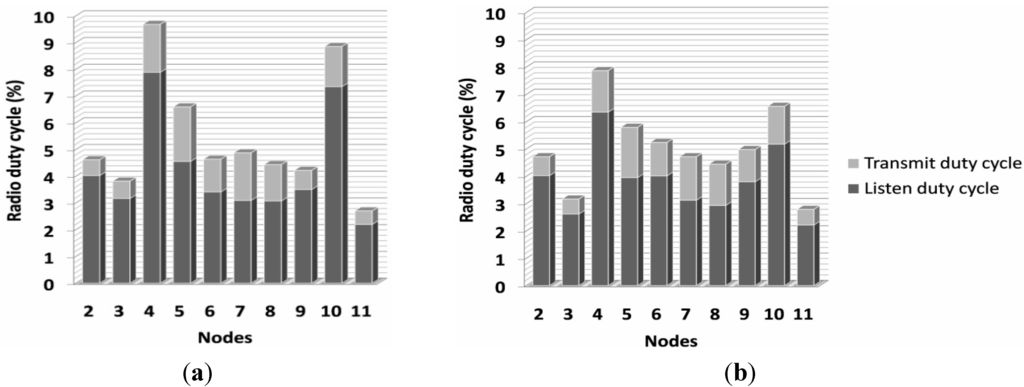 In Figure 8b, the effects of two routing models on the energy consumption performance is illustrated. In comparison with the simulation results in Section 5.2, we have to admit that the behavior is different from the expectations. This outcome can be explained by the following reasons: the nodes in the simulation tests have the same link conditions but the field test nodes do not have the same link conditions. In other words, the repair mechanism for detecting routing loops is initiated more often in the real world tests, and this could be responsible for an increase in the power consumption. Furthermore, the current prototype system cannot provide low MCU power mode due to the lack of an appropriate solution using Contiki process management to deal with the correlation between the AVR MCU and the NANO module. Thus, keeping MCU in normal working mode is a safe and temporary method to evade these potential issues. Besides, in our tests, if the radio chip enters sleeping mode or the uIPv6 process is trying to send/receive a packet, and at the same time, the process of reading NANO’s state has a certain level of communication delay, the wake-up interval in this node will become unstable and lose the synchronization with its neighbor nodes, and this leads to the failure of subsequent radio transmissions. Although this is an event with a very small possibility, the tests show that it will happen within the duration of 20 to 30 h. Thus, the RDC mechanism (i.e., fast sleeping and low power listening) in the ContikiMAC model and the transmission of collect-view application packets are designed to have a short intermission when they have conflicts with the NANO process. This could also cause the augmentation of radio duty (depicted in Figure 9).