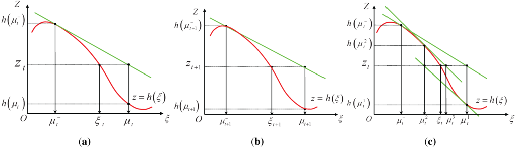 Figure 1c illustrates the relinearization of the nonlinear measurement function for three iterations. As shown in the figure, each new estimate can be obtained by the true measurement and the approximated function around the previous estimate. We can specify the number of iterations we want to perform in advance according to the designer’s experience. It should be noticed that the iterative form of SEIF only relinearizes the measurement model.