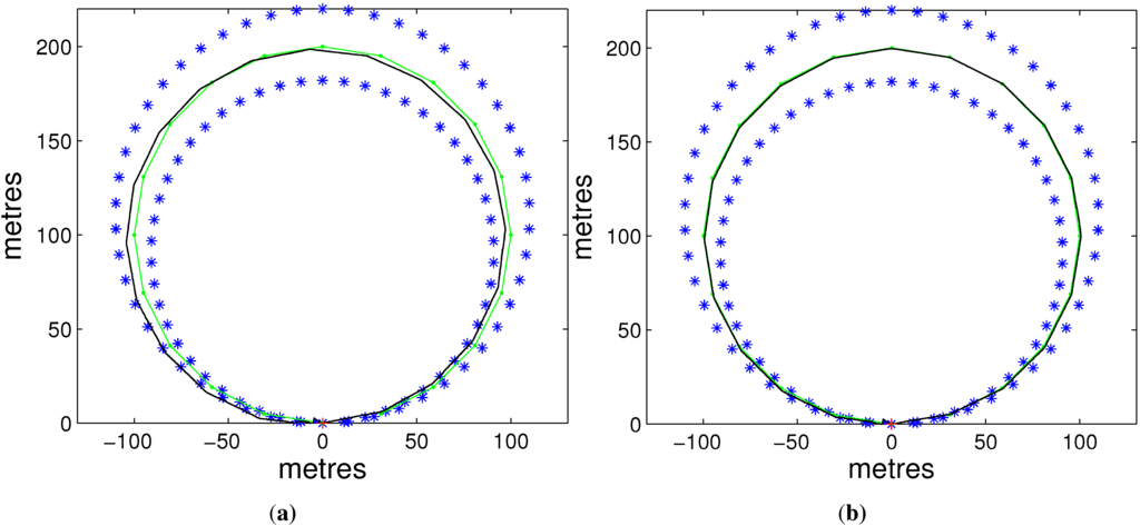 where are the positions of landmarks and is the observation noise. The observation model we use is the vector , where r and b are the range and bearing between the landmark and the vehicle, respectively. In terms of the map, a circle trajectory composed of 20 points is designed as the waypoints, and 200 landmarks lie astride the waypoints, which form two circles, as well.