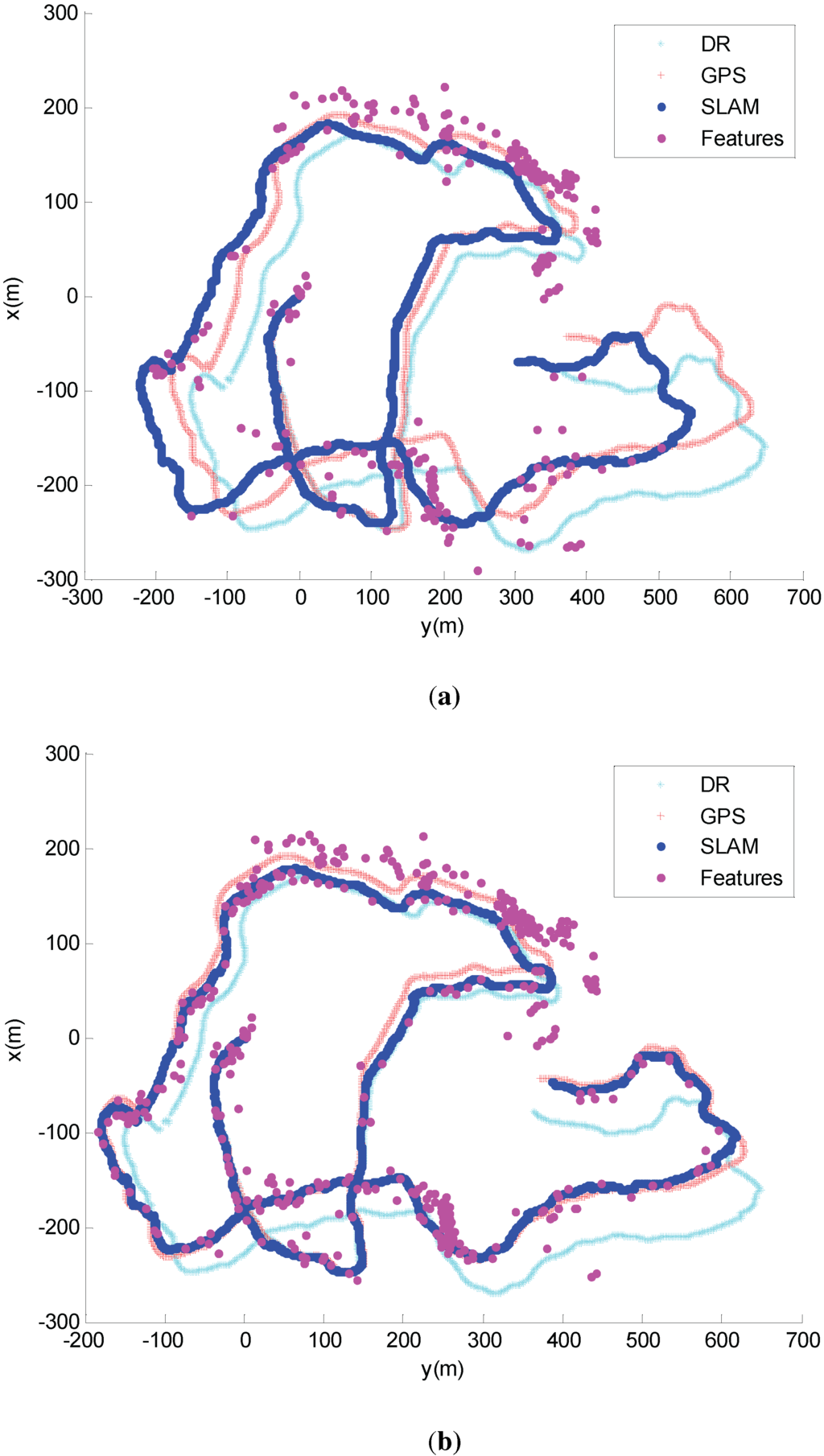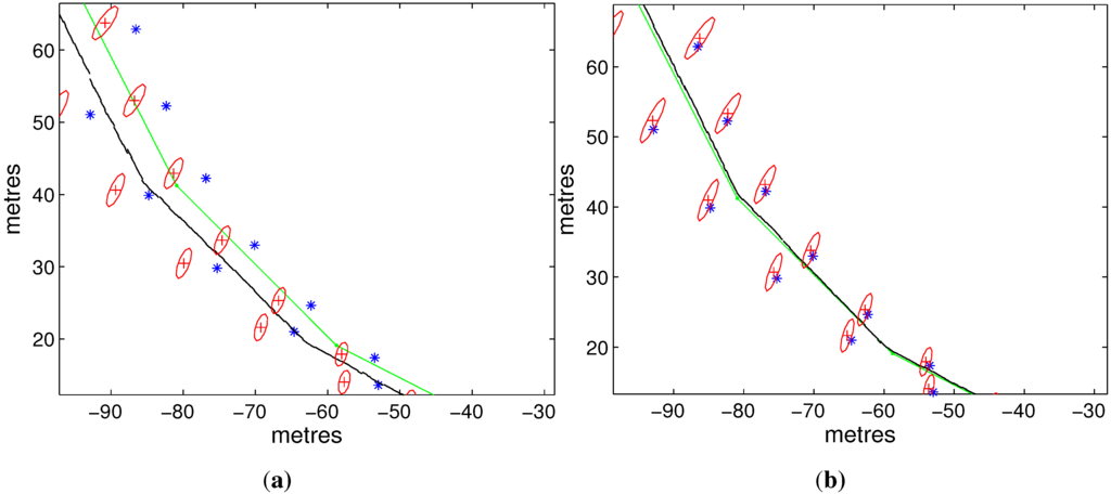 The comparison result of the trajectories is illustrated in Figure 14, where the red line represents the GPS trajectory, the light blue is for dead reckoning and the dark blue is for the SLAM. Here, Figure 14a,b shows the result of SEIF and ISEIF, respectively. As the figures indicate, the trajectory estimated by ISEIF fits the GPS trajectory better than that of SEIF. Owing to the great amount of sonar data, there exist some redundant features inevitably. Thus, raw data measured by sonar are preprocessed to reduce the computation, and the feature extraction algorithm is the same as in [29].