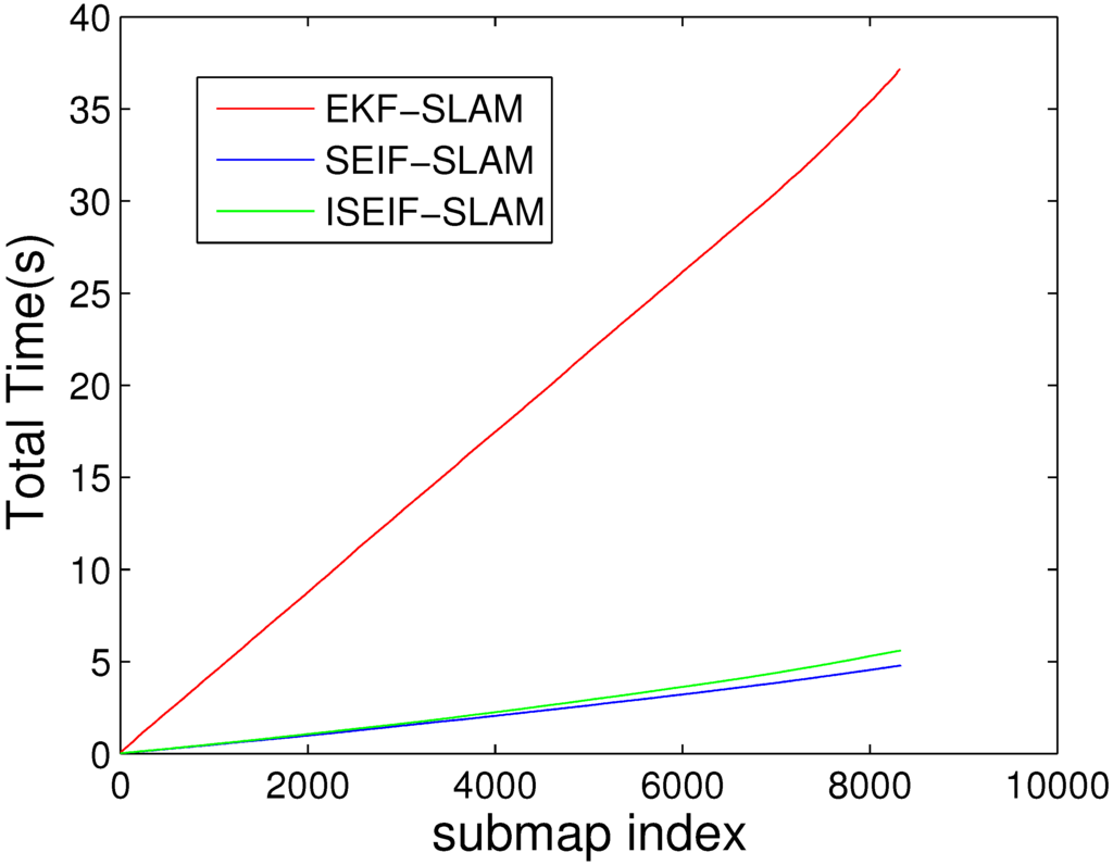 For the purpose of demonstrating the speed advantage of ISEIF, the total CPU time is presented. The comparison of the average time of 50 Monte Carlo experiments between EKF, SEIF and ISEIF is illustrated in Figure 6. According to the results, the total execution times of EKF, SEIF and ISEIF are 37.1720 s, 4.7845 s and 5.5987 s, respectively. Thus, we can see that compared to EKF, SEIF and ISEIF are dramatically time saving. As for ISEIF, it only consumes a little more time than SEIF, but improves the estimate accuracy and consistency.