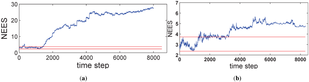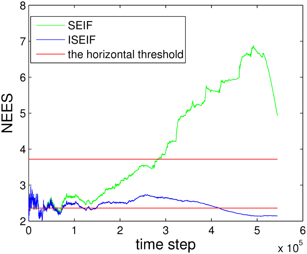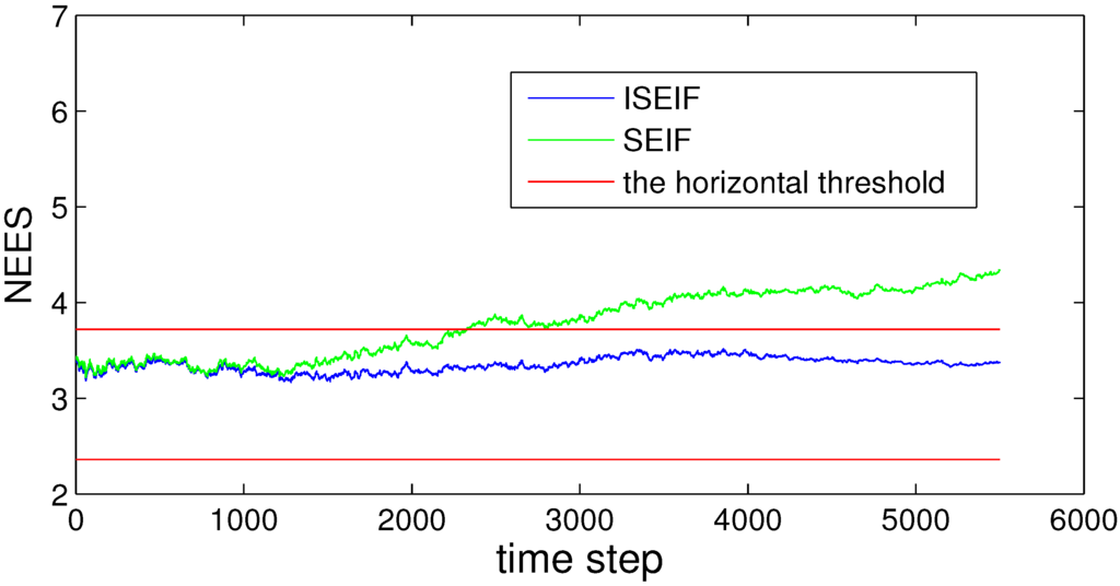 Compared to SEIF, ISEIF also shows superior performance in terms of consistency, which can be reflected apparently by NEES in Figure 16. The NEES value of ISEIF is mostly bounded in the threshold interval, while the NEES value of SEIF soon goes beyond the upper threshold. According to Figure 4, Figure 9 and Figure 16, NEES of ISEIF can basically keep close to the threshold and maintain a relatively lower value steadily, while the corresponding NEES of SEIF tends to deviate far away from the threshold. In summary, ISEIF can effectively optimize consistency.