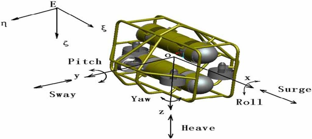 In the following experiments, a C-Ranger AUV loaded with a series of sensors was designed to navigate in underwater circumstances. The C-Ranger is an open-frame AUV, shown in Figure 11, and its general parameters are listed in Table 4. The AUV system is comprised of two electronic cabins and five underwater propeller thrusters. Figure 12 illustrates the coordinate system of the C-Ranger platform. Five degrees of freedom (DOF), including yaw, pitch, roll, heave and surge, contribute to the good maneuverability of the AUV. The thrust system consists of five propeller thrusters. Two of the thrusters paralleling to the bow direction installed in the abdomen are in charge of horizontal thrust related to the surge and yaw, and the other three are vertical thrusters for heave, roll and pitch. The upper hull of the C-Ranger is the instrument compartment containing sensors, the computer module, the communication module, the internal monitoring module and other devices. The lower hull is the power supply system mainly made up of lithium-ion batteries, the power management module, the motor-driver module, etc.
