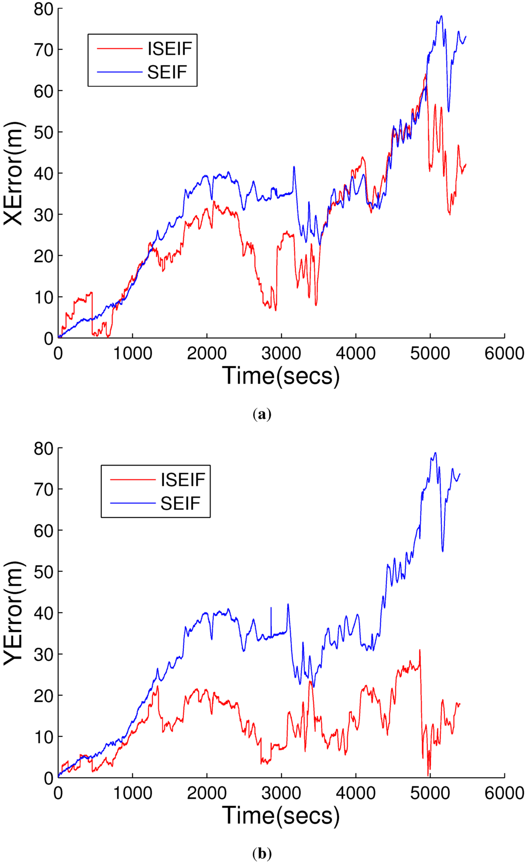 Comparisons of the results estimated by SEIF (a) and ISEIF (b) in the experiments of the sea trial.