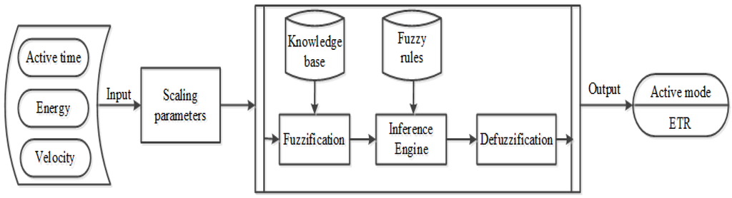 Instead of classical linear controllers or mathematical models, we introduce a fuzzy logic-based controller in this article due to its simplicity, clarity and suitability with WSN applications. Fuzzy systems are very useful in situations involving a highly complex system whose behaviors are not well understood and in situations where an approximate, but fast, solution is warranted []. Since guaranteed lifetime and real-time communication in wireless sensor networks are dealing with both kinds of situations, therefore a fuzzy system can be an ideal possible solution. To deploy it in the real world, the proposed fuzzy controller algorithm must be installed on both sink and sensor nodes in the network. The fuzzy controller in the sink node accepts input descriptors, energy and active time, for active/sleep scheduling. Similarly, fuzzy controllers in sensor nodes use controllable inputs of energy and velocity for the selection of the next hop relay node. The proposed fuzzy system consists of three parts; fuzzification, inference engine and defuzzification, as shown in Figure 1, along with fuzzy system factors. Through the proposed fuzzy logic, fuzzy logic determines a node role for the next round, either active or sleep, by taking the active time, velocity and energy on the node. Upon identifying the possible active nodes, a node is designated as either ETR or NTR. Therefore, each node’s rule for next round is determined by the proposed fuzzy logic consequently.