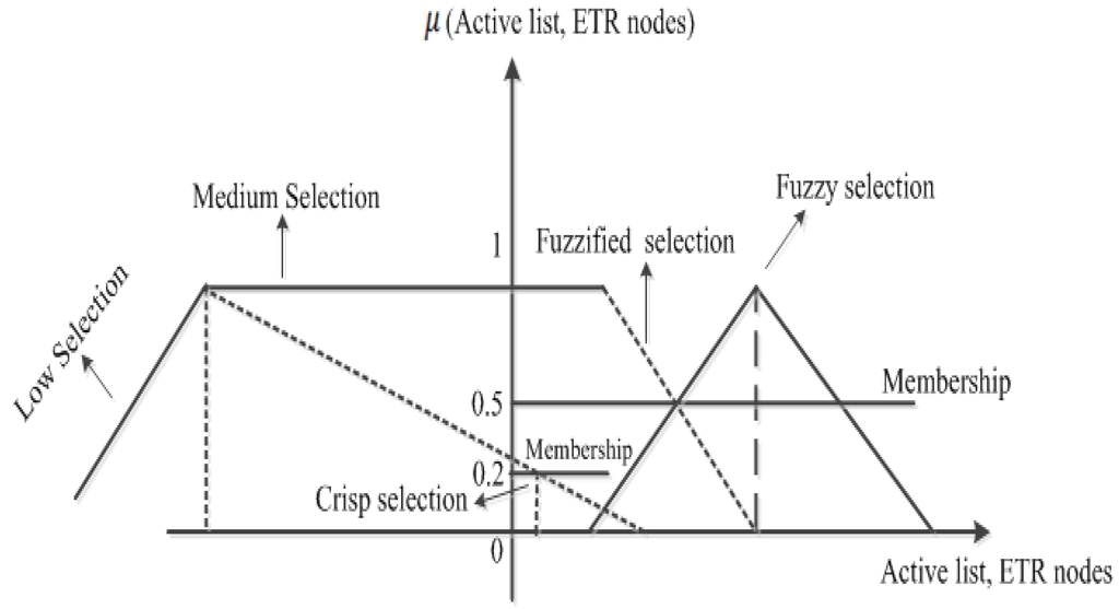 Fuzzy logic deals with the analysis of information by using fuzzy sets. Figure 2 shows the detail of a fuzzy dataset that considers the active/sleep scheduling and ETR relay node selection as a crisp and fuzzy selection, respectively. In addition, Figure 2 further shows the comparison between a crisp active/sleep scheduling and an ETR selection with a fuzzy set represented as Low. Moreover, the figure shows that the crisp selection intersects the fuzzy set at a membership value of 0.2, which is considered as L. Similarly, the intersection of the fuzzy set M, the fuzzified active set and ETR selection occurred at a membership value of 0.5, as shown in Figure 2. Furthermore, it is noticeable that the intersection of the two fuzzy sets is a small triangle whose largest membership value is equal to 0.5, measured as M.