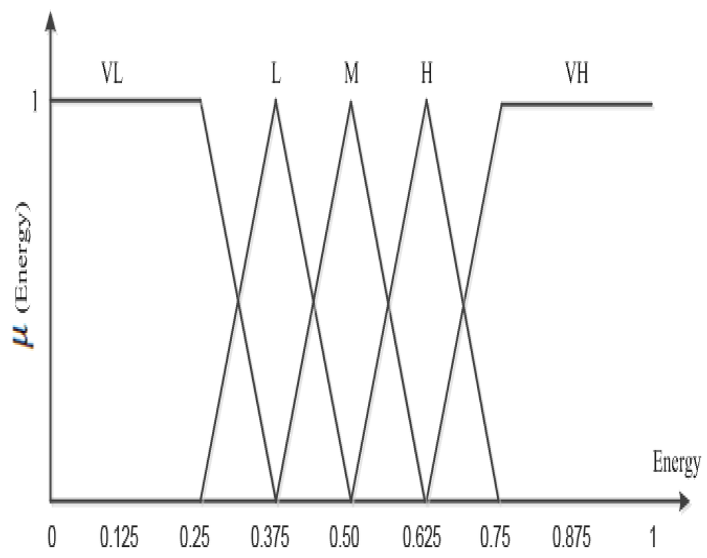 In this paper, we use the linguistic variables, such as Very Low, Low, Medium, High and Very High, represented as VL, L, M, H and VH, respectively, for fuzzy sets. The fuzzy sets H and VH contain active sensors S and ETR relay nodes having (S) = 1 and (ETR) = 1, where μ represents the degree of membership function and N represents the number of sensors in the network. The M includes those active sensors S having . Similarly, fuzzy set M for ETR relay nodes contains active sensor nodes having . The fuzzy sets L and VL contain active sensors S having and ETR relay nodes having .