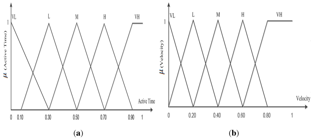 The input descriptors, energy and active time, in a proposed fuzzy control system have the linguistic values VL, L, M, H and VH, and the membership functions are shown in Figure 3 and Figure 4a. The membership functions indicate that if the energy and active time of a sensor node increases or decreases, the change occurs accordingly. The fuzzy controller output becomes successful if each sensor node i has remaining energy greater than zero and unsuccessful if any node i exhausts its energy level. The proposed scheme ensures that a fuzzy controller keeps the energy consumption balance among sensor nodes to achieve α. Figure 3 and Figure 4a show the degree of membership functions for the inputs and outputs of energy and active time, respectively. To consider each node’s energy and active time, the fuzzy controller assigns a triangular fuzzy value that specifies the range for a given level instead of a particular discrete value. Thus, the triangular fuzzy value provides an easy solution for the described problem with two parameters, i.e., center point and the distance between the extreme points and the center point. To show the membership function for energy β and time α, the fuzzy controller generates an output value from the set of (0,1).