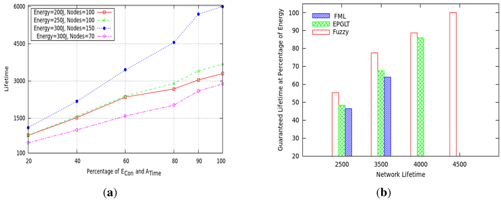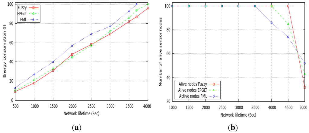 Moreover, the proposed scheme compared four a priori determined lifetimes α ∈ (2500 s, 3500 s, 4000 s, 4500 s) on a network with the same parameter settings against the FML and EPGLT protocols in Figure 5b. The proposed fuzzy controller achieved the pre-configured lifetime at the rate of 55%, 77.77%, 89% and 100% total energy consumption, respectively. As shown in Figure 5b, the FML and EPGLT protocols did not consume their total energy; however, some of the nodes in the network drain out their energies at an early time due to unbalanced energy consumption. This fact brings the network lifetime to an end in both FML and EPGLT protocols.