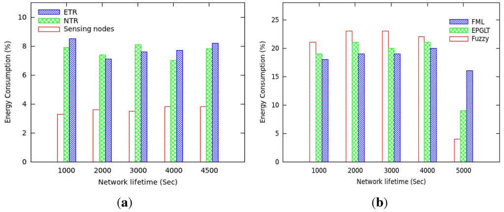 The transmission range of sensor nodes can affect the network lifetime. Our scheme is dealing with different transmission ranges for real-time packets; therefore, we evaluate the performance of the proposed fuzzy model under different settings of transmission range. Figure 7a,b shows the results of our proposed approach with a view toward studying the effect of incorporating the energy consumption objective in the guaranteed lifetime process. Recall that the proposed scheme assigns different transmission range relay nodes to routes in real-time and non-real-time data packets. In order to study the energy consumption of the proposed protocol on each active node in a three-tiered model, we examined the different set of nodes over the network lifetime and plotted the results in Figure 7a. The plots showed that the energy consumption in NTR and ETR relay nodes are nearly the same due to the energy and active time-aware schemes applied by the fuzzy controller through fuzzy inference rules in the network to achieve the guaranteed lifetime. The set of active sensors responsible for sensing the network field consumes energy almost at the same rate in all rounds.