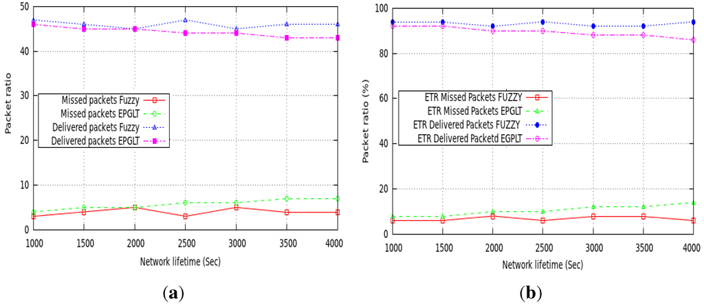 Performance comparison of real-time data packets in a guaranteed network lifetime between the proposed scheme and EPGLT is discussed in this section. To evaluate the performance of packet delivery in Figure 8a, the simulation is performed on the average ratio of successful and missed end-to-end packets toward the sink. The proposed protocol selects the next hop relaying node through the fuzzy controller and adjusts extended transmission on real-time packets to achieve the end-to-end deadline in the network. To see the significance of the proposed scheme, we assign different deadline values ∈ (150 s, 200 s, 250 s, 300 s) to real-time packets. We run the simulation 100 times for different settings of real-time packet deadlines and plotted the average results in Figure 8a,b. Figure 8a further demonstrates both the fuzzy and EPGLT schemes using multi-hop routing techniques to route data packets to achieve soft real-time communication. Even though EPGLT is based on a mathematical model to select the next hop relaying node, its delivery ratio is lower than ours, since it assigns the same transmission power to forward a real-time packet toward the sink.