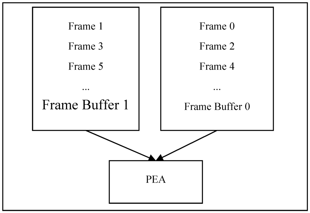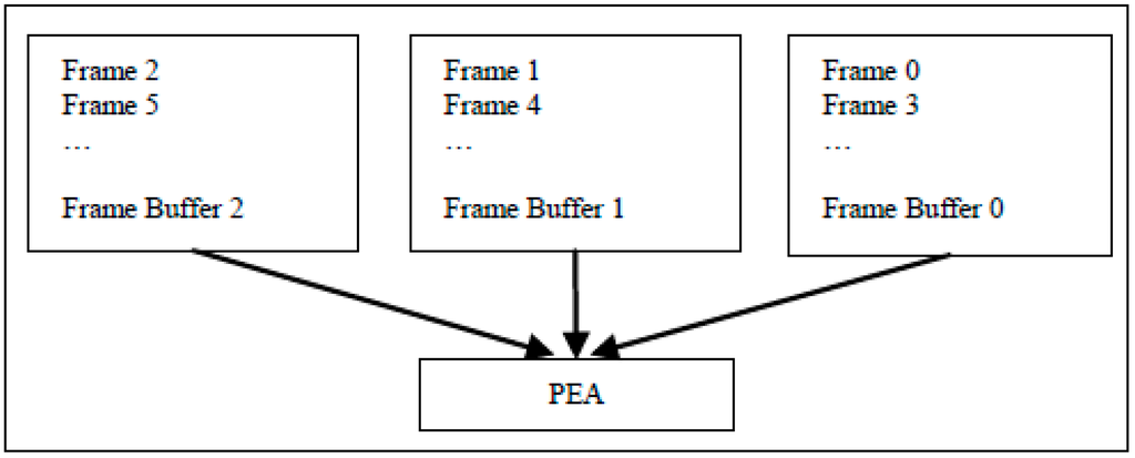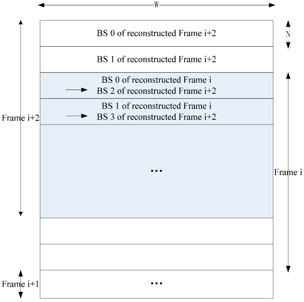 For VC-MRME, two reference frames are used for a current frame to explain how to implement inter-frame data reuse scheme but more reference frames are also supported. Figure 7 gives an implementation with three reference frame buffers on chip. The processing steps are shown in Figure 8. Circular buffer is used to reduce the frame buffer size (Figure 9). Frame i and Frame i + 2 share H/N − 2 BS buffers, and the frame buffer size is reduced from 3 × W × H to 2 × W × H + 2 × N × W. Ra is 1 for Inter-E of VC-MRME because only the current frame is loaded from off-chip memory and no reconstructed frame is stored to or loaded from off-chip memory.