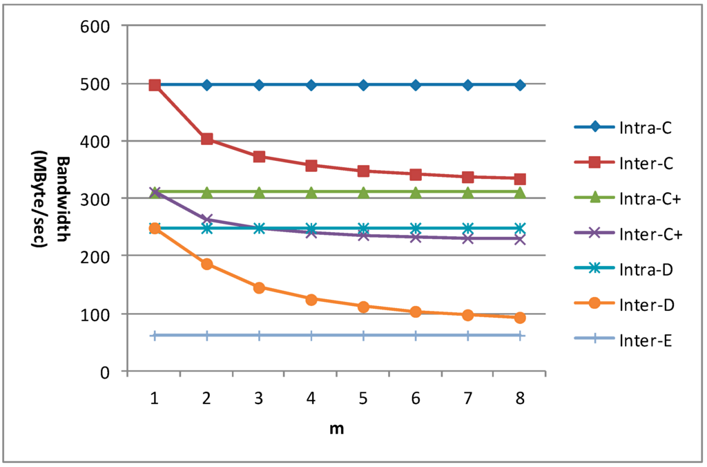 The bandwidth requirement for 1080 p with different m is given in Figure 22 for different data reuse levels of VC-MRME. n equals 4 in the C+ scheme and r equals 2. We can find that the bandwidth requirements of all the intra-frame data reuse levels (including Intra-A and Intra-B which are not shown in the figure) and Inter-E are unchanged with the variation of m. When m equals 1, the bandwidth requirement of the inter-frame data reuse level is the same as that of its corresponding intra-frame data reuse level. The bandwidth requirements of Inter-C, Inter-C+, and Inter-D become lower with the increase of m, but the bandwidth reduction magnitude becomes smaller because there is always a constant which will not change with m in the formula of Ra.