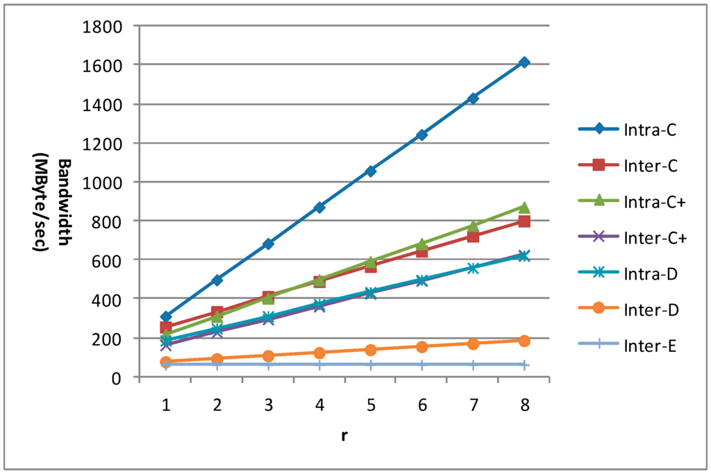 The value of r is a factor which can reflect how the number of reference frames affects the memory traffic of different data reuse levels for VC-MRME, so we give the bandwidth requirements of different values of r when n equals 4 and m equals 8 in Figure 23. There is a linear relationship between the value of r and the bandwidth requirements of different data reuse levels, which means that a larger r will lead to more memory traffic because more data need to be loaded from off-chip memory. The slope of an intra-frame data reuse scheme is larger than that of its inter-frame counterpart, which means that memory traffic of the intra-frame data reuse increases faster with r than its inter-frame counterpart. Therefore, the proposed inter-frame data reuse scheme is more scalable than the traditional intra-frame data reuse scheme for multiple reference frames ME.
