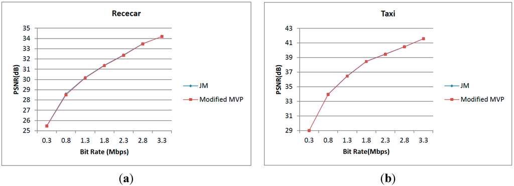 Comparison of RD curves between JM and modified motion vector prediction. (a) The comparison between JM and modified motion vector prediction in Racecar; (b) The comparison between JM and modified motion vector prediction in Taxi.