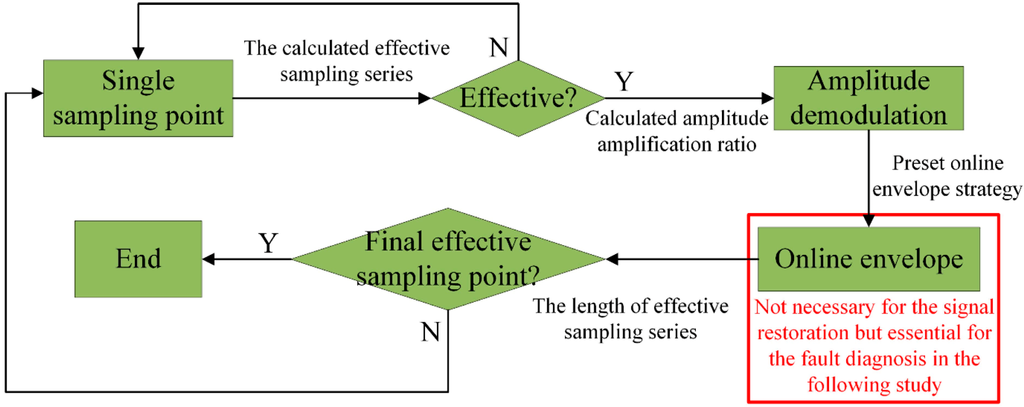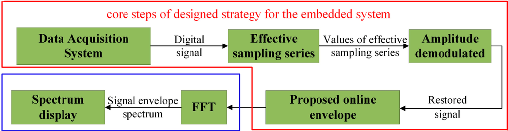 Motivated by the above analysis, an online fault diagnosis strategy called online Doppler effect elimination (ODEE) based on acoustic signal analysis technique is proposed in this paper for the ADBD. The analysis process of the proposed ODEE strategy is illustrated as follows: (1) the spatial and temporal parameters of the constructed kinematic model for the train movement is obtained in advance; (2) the proposed simplified unequal time interval strategy is taken and the distorted amplitude of the signal is demodulated as well; (3) the Doppler-free acoustic signal is restored and the characteristic frequency of the defective signal can be detected through the envelop spectrum of the restored Doppler-free signal. The procedure of the proposed ODEE strategy can be achieved online, which means the time consumption is less than that of the traditional offline strategy. Both simulation study and real train defective bearing signal process demonstrate that a remarkable performance is achieved by using the proposed ODEE method in the restoration of the Doppler distortion signal. Ultimately, the ODEE is implemented in a designed embedded system in bearing fault diagnosis and condition detection. The effectiveness of the proposed method is further verified. In summary, compared to the off-line strategy, the proposed ODEE strategy has the following properties: (1) the simplified unequal time interval strategy can be applied for online sampling to eliminate the Doppler effect; (2) The algorithms are designed for online running, e.g., the online envelope strategy; (3) A low-cost, low-powered, and high-efficiency embedded system is designed for the ODEE method, so the proposed ODEE technique is of low resource consumption and high efficiency when comparing to the traditional offline methods.