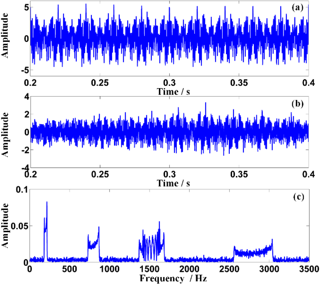 The Doppler effect of the simulated signal: (a) the waveform of the origin signal with SNR of 10 dB; (b) the waveform of the Doppler distorted signal; (c) the frequency spectrum of the Doppler distorted signal.