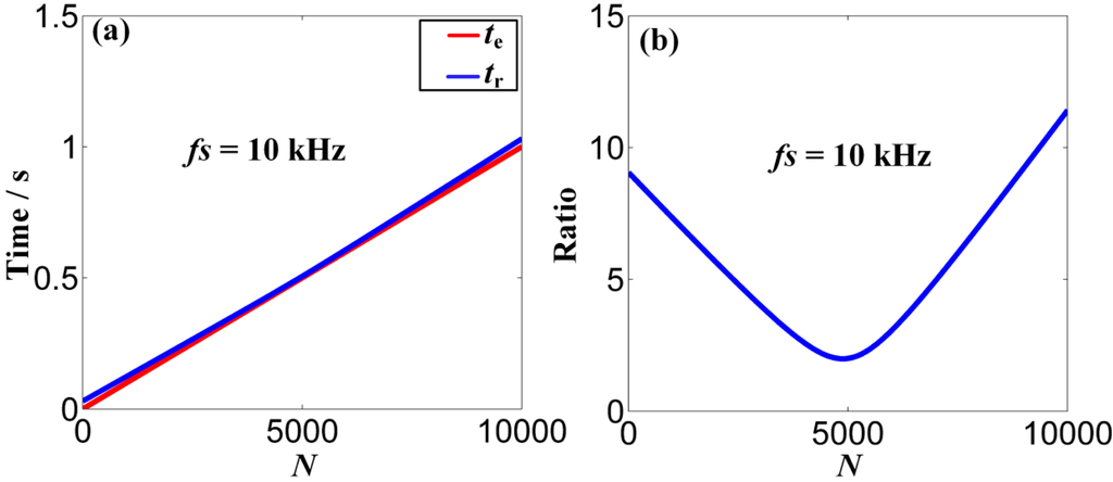 (a) Comparison between the scheduled emission time vector and the scheduled reception time vector with the scheduled frequency fs of 10 kHz; (b) the amplitude modulation ratio of the effective sampling series with the scheduled frequency fs of 10 kHz.