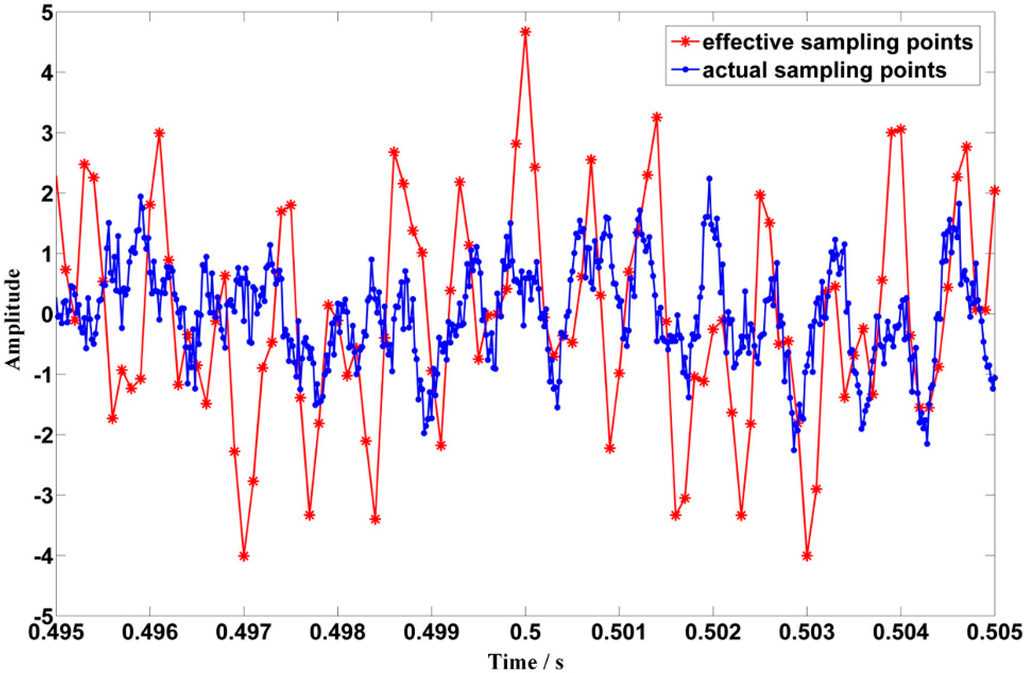 Figure 7b, the amplitude distortions are demodulated. Afterwards, a comparison between the actual sampling series and the demodulated effective sampling series is conducted, which is employed to explicitly illustrate the processing procedure of the proposed strategy. The result is shown in detail in