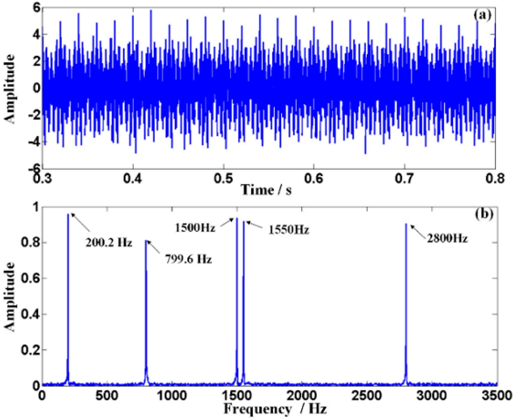 t) denotes an additive Gaussian white noise, and the signal-to-noise ratio (SNR) of the signal is set as 10 dB.