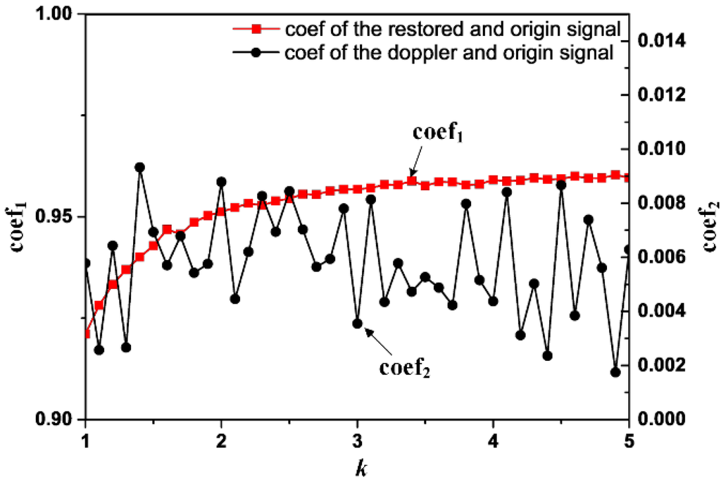 k and tends to be stabilized. While the correlation coefficient of the origin signal and the Doppler distortion signal (coef