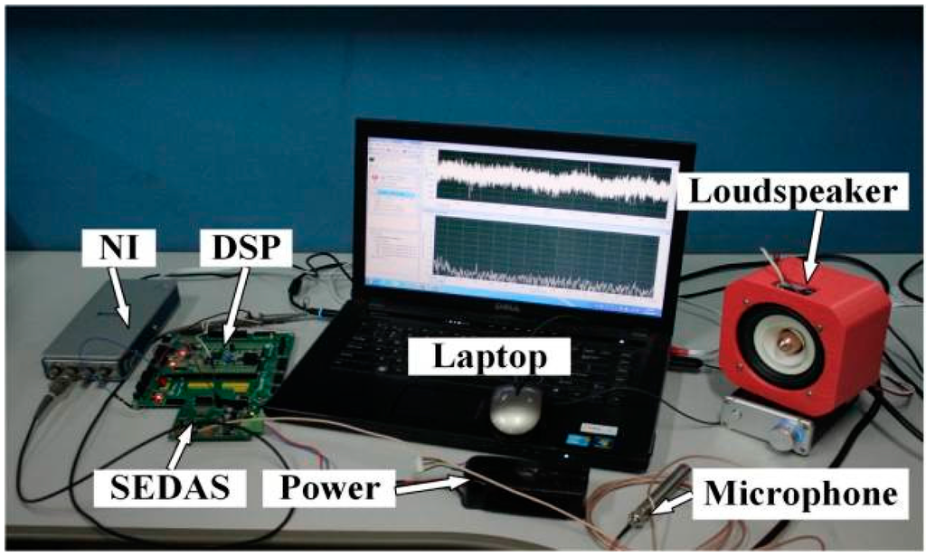 Figure 11, a loudspeaker is used to play the acquired actual Doppler distorted signals. A microphone is employed as the acoustic sensor for the signal acquisition of the embedded system. To accomplish the ODEE strategy, an embedded system composed by a self-designed embedded data acquisition system (SEDAS) and a digital signal processing (DSP) system is designed. The restored signal is processed via the system and the output can be observed on the laptop via the NI DAS to verify the effectiveness of the ODEE method. The module diagram of the designed hardware system is shown in