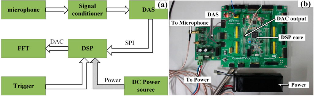 Figure 12b. The maximal sampling rate of the SEDAS that is based on an analog-to-digital converter MAX1300 (Maxim Inc. Roanoke, VA, USA) is 115 ksps. The signal conditioner is composed of an operational amplifier MAX9632 (Maxim Inc. Roanoke, VA, USA) and the power supply for microphone is provided by an LM334 (STMicroelectronics Inc. Geneva, Switzerland). First of all, STM32F407VGT6 (STMicroelectronics Inc. Geneva, Switzerland) is based on the high-performance ARM Cortex-M4 platform. Besides, the floating-point processing unit (FPU) of the Cortex-M4 core supports all ARM single-precision data processing instructions and data types, which is essential for the restoration procedure of the proposed ODEE method such as the online envelope procedure, analog to digital transform. Additionally, it is a reduced instruction set computing (RISC) processor with a full set of DSP instructions to make the programming procedure easier. The designed application security can be enhanced by the memory protection unit (MPU) as well. Meanwhile, the incorporated high-speed embedded memories and the standard and advanced communication interfaces make it adaptive to complex situations. Furthermore, with the help of its DAC, the output can be transformed into analog signal and transmitted to other equipment for further analysis. The maximal frequency of the processor unit is up to 168 MHz, 210 DIPS. Moreover, the price is fairly low and the power consumption control is excellent. Thus, STM32F407VGT6 is chosen as the DSP core of the designed embedded system. With the help of the digital-to-analog converter embedded in the DSP, the restored Doppler-free signal can be collected with NI DAS and transmitted to the laptop that connected to NI DAS for further analysis.