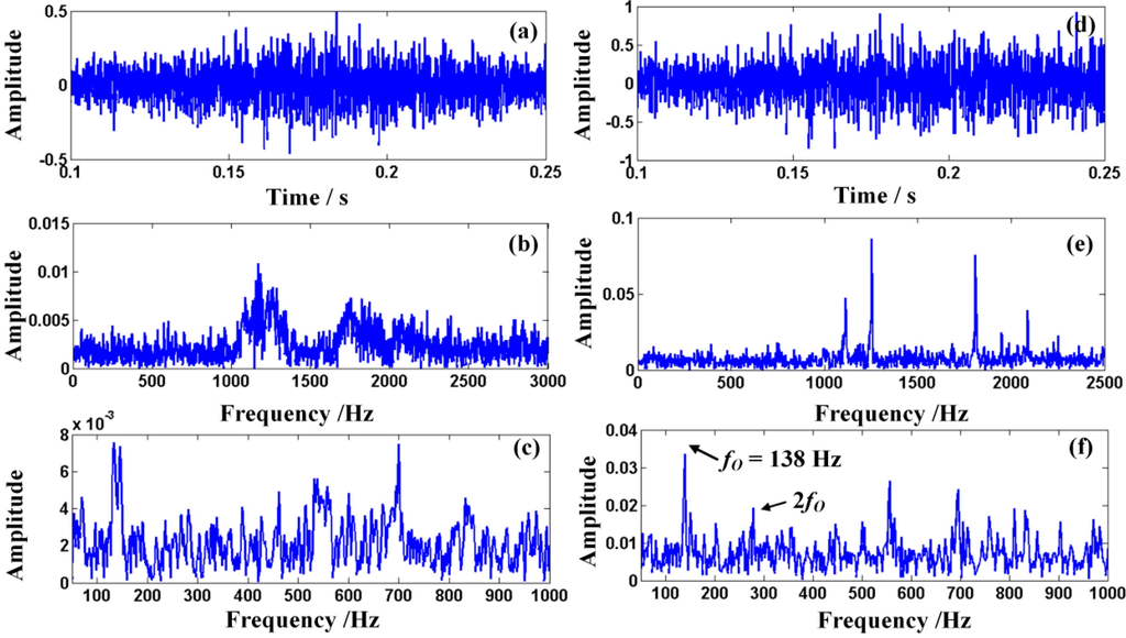 Figure 13f, the characteristic frequency of the restored signal and its harmonic can be obtained. The characteristic frequency can be detected as 138 Hz, which is rather close to the theoretical value