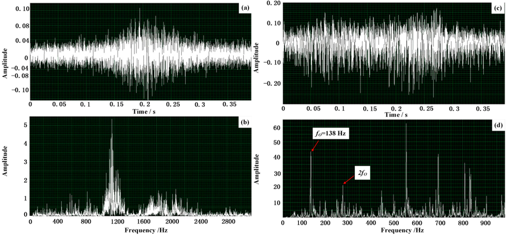 Subsequently, the acquired Doppler acoustic signal of the bearing with outer-race defect is taken in the designed system to validate the effectiveness of the algorithm implementation and hardware design. Firstly, the acoustic signal of the fault bearing with outer-race defect acquired by the aforementioned experiments is used as the input signal of the embedded system and its waveform and spectrum are displayed in