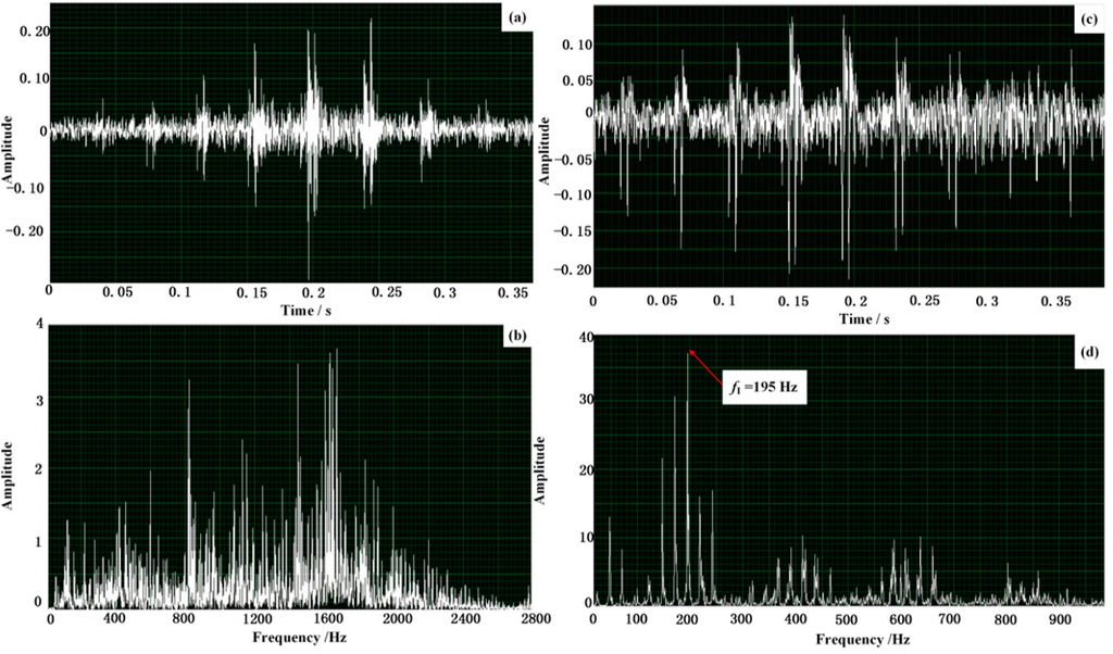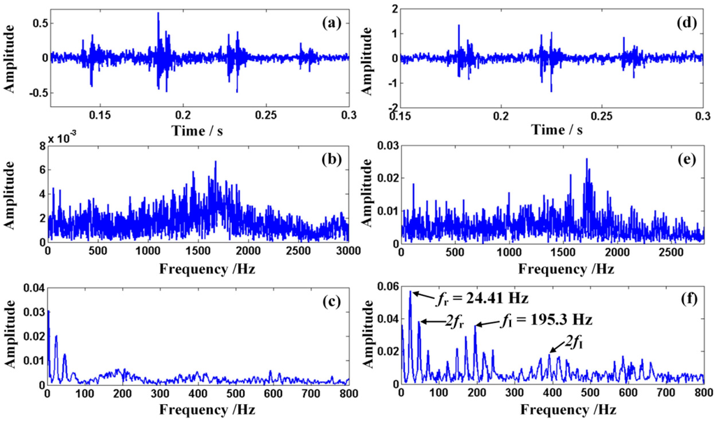 Figure 16c,d, which display the waveform and the spectrum of the output restored envelope signal, respectively. It is obvious that the frequency domain of the distorted signal has been restored and the feature frequency can be observed as 195 Hz, which is rather close to the aforementioned theoretical value