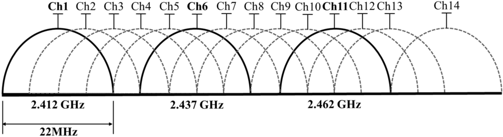 The IEEE 802.11, called Wi-Fi (wireless fidelity), is a wireless networking technology. The commonly used protocols are IEEE 802.11b/g/n and transmitted by APs. The IEEE 802.11b/g uses 2.4 GHz bands. The IEEE 802.11n uses both 2.4 GHz bands and 5 GHz bands. In this paper, IEEE 802.11b is selected as the communicating protocol. One of the considerations is that 2.4 GHz network covers a larger range than the 5 GHz network [13], and the other is that the APs in the building under consideration commonly uses IEEE 802.11b to send packets. A packet is defined as a piece of communicating information transmitted from a device based on the IEEE 802 series standards. In the case of the IEEE 802.11b, the non-overlapping channels are 1, 6, and 11, as shown as Figure 1, and it is more possible to increase the available performance capacity of the network in these channels [14]. As a result, the non-overlapping channels are used for the Wi-Fi indoor positioning system developed in this work.