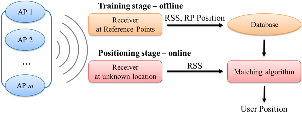 The fingerprinting approach consists of two stages: the training (calibration) stage and the positioning (verification) stage [9,11]. The training stage is intended to build up the database. First, an appropriate number of RPs are selected. The number of RPs determines the position granularity. Then, the RSS values are for the signals transmitted from APs that are measured at all RPs, and the measurements are recorded as fingerprints in the database. In the positioning stage, the user measures the RSS of APs at an unknown location. The measurements are considered to be a location tag. The user position can be determined after matching the measurements to the fingerprints in the database. The process for the fingerprinting approach is illustrated in Figure 2. A matching algorithm is the dominant factor related to the accuracy of the fingerprinting method. Other important factors are the RSS database generation and its size, and these factors are investigated in this work.