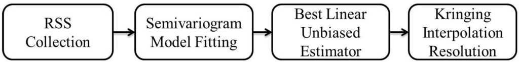 The Kriging algorithm is utilized to reduce the training effort and to enhance the positioning performance. The Kriging algorithm predicts a value at an unobserved location based on known data. The purpose is to create a spatial structure which can be represented by a mathematical function to provide continuous values. The assumption of the Kriging algorithm is that a spatial random variable is spatially dependent, that is, the nearby points are more similar than those that are far away. In this paper, the spatial random variable is the RSS of the IEEE 802.11. The flowchart of the Kriging algorithm is depicted in Figure 3: