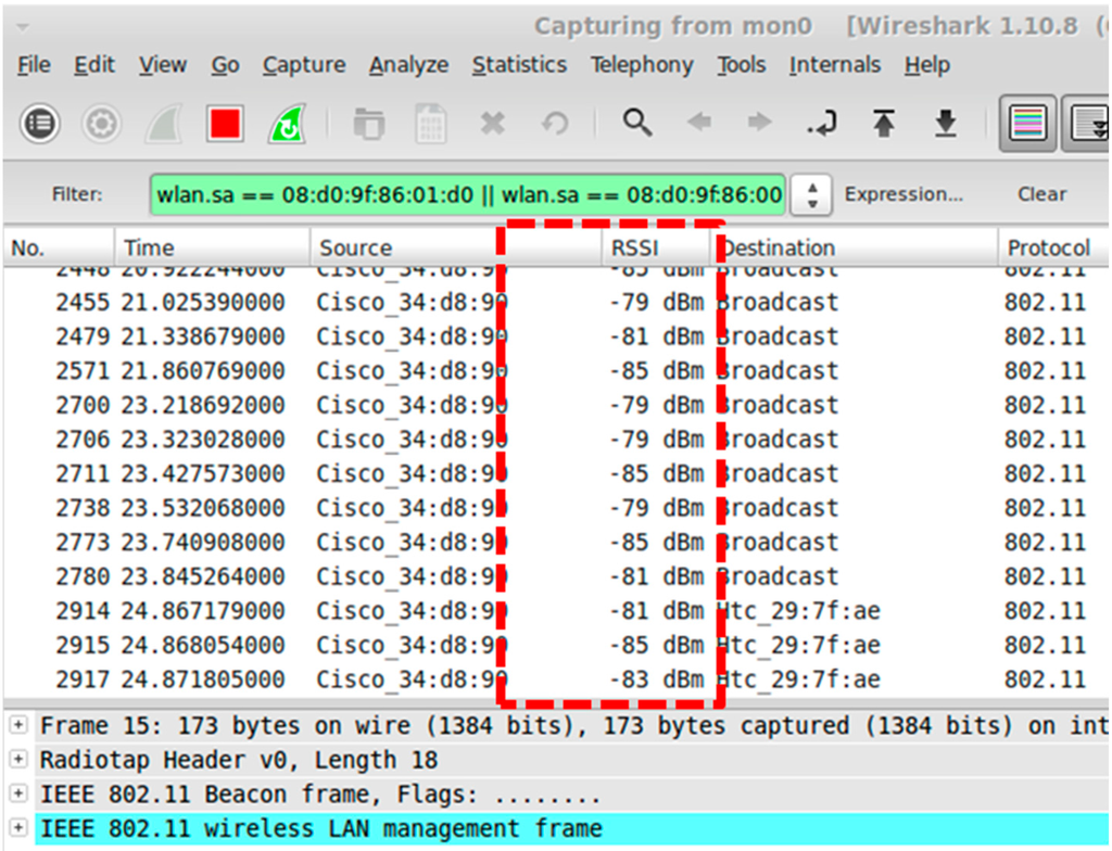 The Department of Aeronautics and Astronautics building at National Cheng Kung University in Taiwan is used as an example to demonstrate the implementation of the IEEE 802.11-based indoor positioning system. The IEEE 802.11-based wireless APs in the building under consideration serve as the transmitters. The receiver of the RSS measurements consists of a laptop and a wireless network card. The signal processing software is Wireshark, which is a network analysis tool [19], and it is used to capture network packets and provides information, including reference time, signal source, and received signal strength indication (RSSI). Figure 5 is a screenshot of the captured packets with the Wireshark tool.