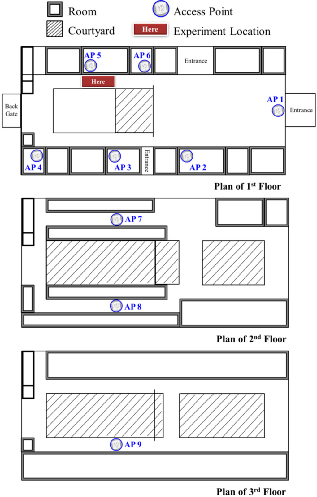 The first floor of the building is selected as the experiment location. The locations of the experimental points are in the corridor. We choose 9 APs to build the RSS database. The setup of the experiment is depicted in Figure 6. Figure 6 is a simple plan of the first to third floors of the department building, and it shows the relative positions between the experimental field and the 9 APs. There are six APs on the first floor, two APs on the second floor, and one AP on the third floor. AP 1 is in the lobby, and AP 9 is in the corridor. AP 7 and AP 8 are in the corridor between the offices, and the others are inside the classrooms.