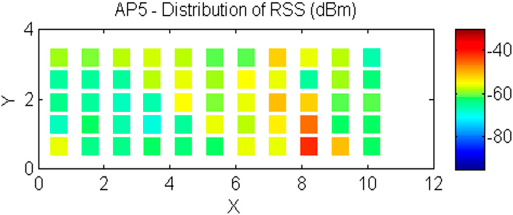 As indicated in Figure 7, we divide the experimental field into 55 points. We visit the RPs in sequence to collect the RSS measurements transmitted from the 9 APs in the building and record the RSS measurements at each point in the experimental field. Figure 7 shows the distribution of RSS values for AP 5. AP 5 has a stronger distribution of RSS values than that of the other APs because AP 5 is the nearest AP in the experimental field.