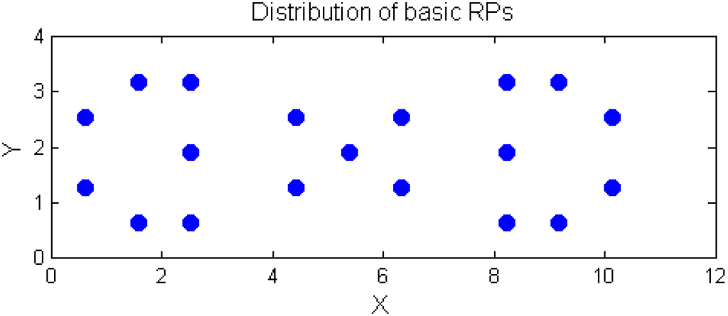 The 19 points of the 55 points we divided in the experimental field are selected as the basic RPs, as shown in Figure 8. This special distribution of RPs is used to consider the irregular RSS measurements at some points. In addition, the 19 RPs are utilized to build the spatial model for the experimental location.