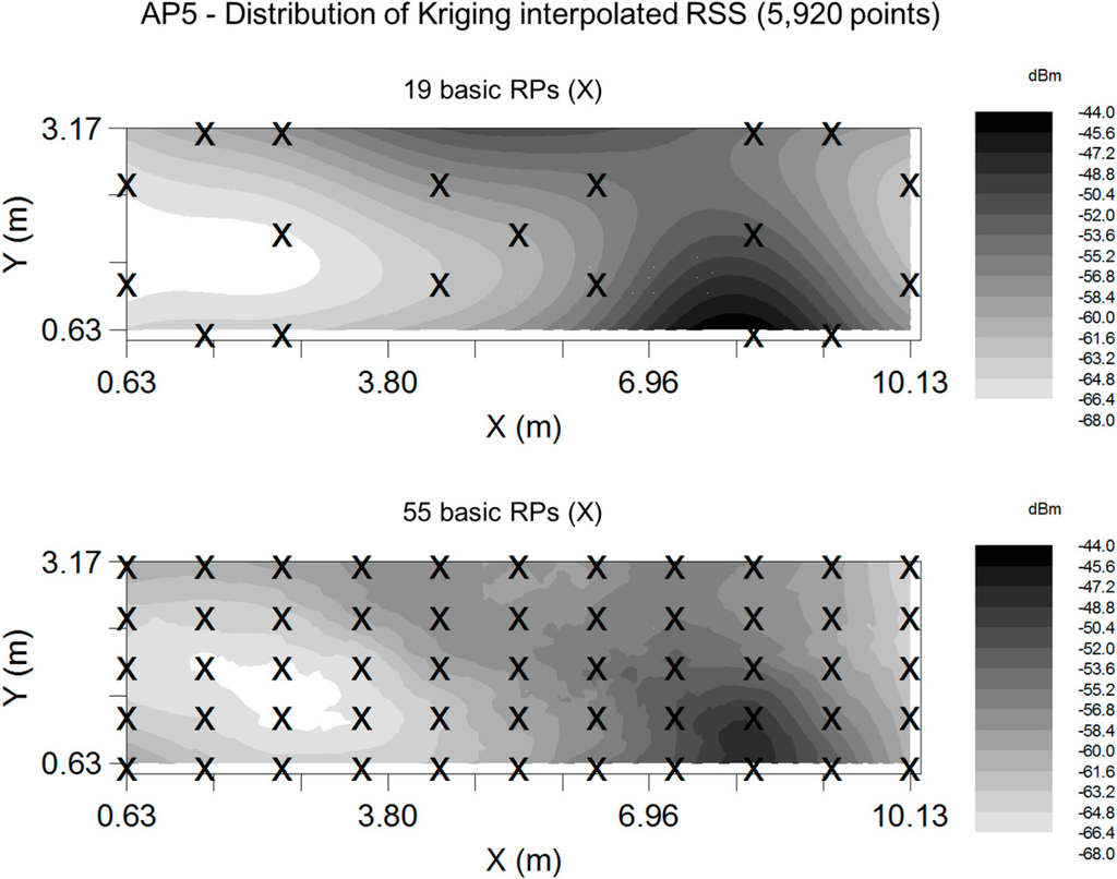 For the RSS-based positioning system, this paper utilizes the fingerprinting approach with the KWNN algorithm. In addition, the Kriging algorithm are applied to generate training points and extend the RSS database for the purpose of positioning. The number of measured points is 55 in the experimental location. We use AP 5 to evaluate the influence of different selections of RPs on the Kriging interpolated RSSs. Figure 9 shows the Kriging RSS maps of the experimental location based on two different RP selections which are 19 and 55 points. As shown in Figure 9, the distribution of RSS based on 19 RPs (top plot) is similar to the one based on 55 RPs (bottom plot). Since the goal of this paper is to reduce the measuring effort on real data at the training (calibration) stage, 19 basic RPs of the 55 measured points are selected to estimate semivariograms and obtain influence range A and sill C.