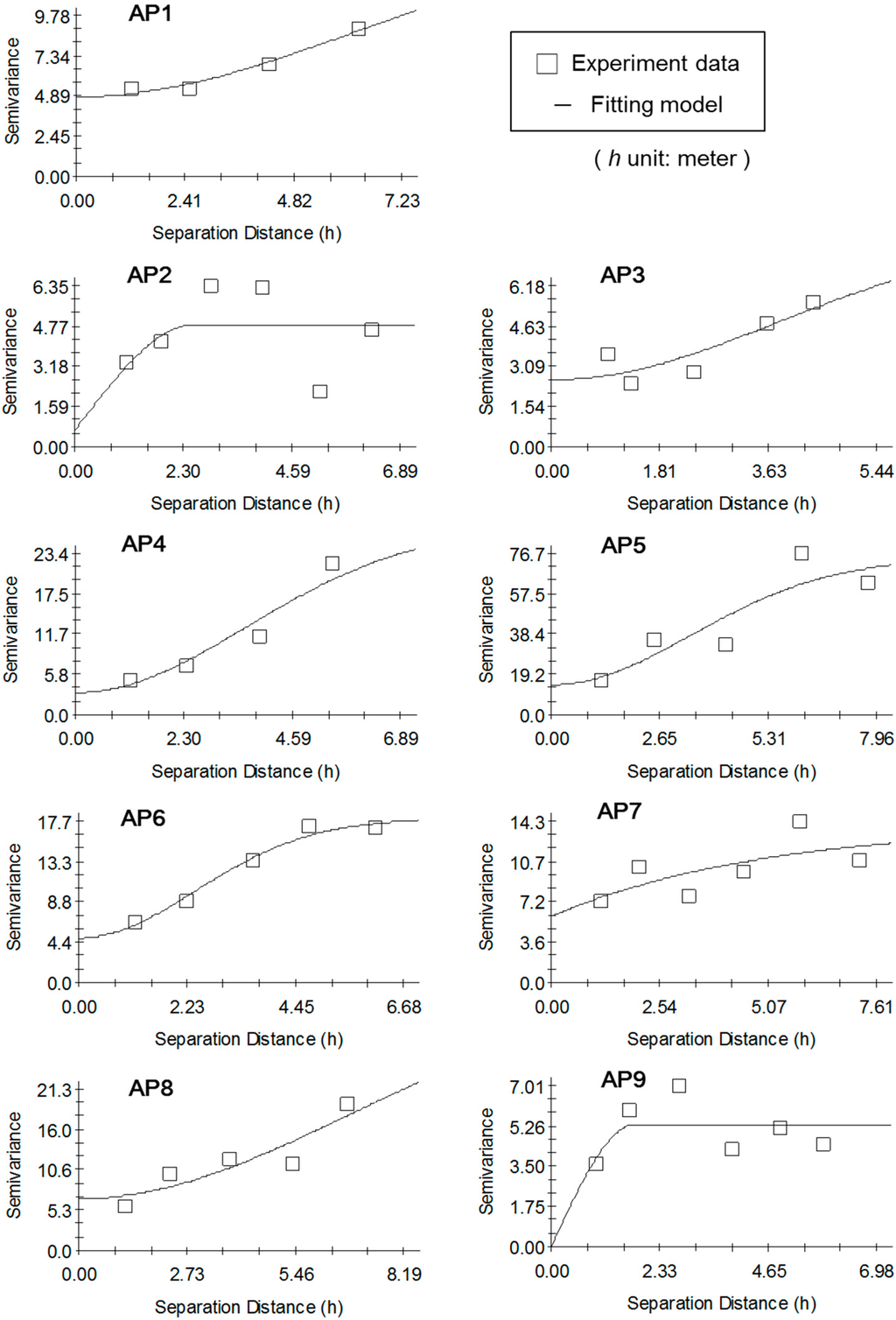 is the number of pairs of sample points separated by h. By Equation (6), an experimental semivariogram can be built. Thus, the experimental semivariogram and the theoretical semivariogram can both be drawn on a plot of γ against h, as shown in Figure 4.