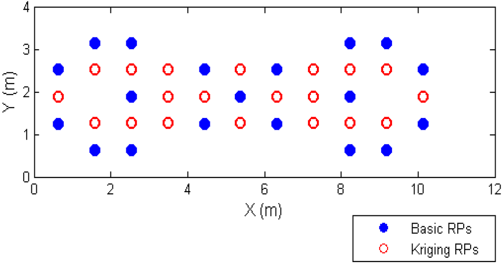 After finishing the Kriging models for the extended database, the positioning performance using the Kinging interpolation method is evaluated. The sizes of the different databases are shown in Table 3. The 19 basic RPs are shown in Figure 8. The Case 1 uses 19 basic RPs and 20 points with real data (i.e., 39 basic RPs), and the other uses 19 basic RPs and 20 points with Kriging interpolation. We used Case 1 to compare the real data and the Kriging interpolated points for both experiments with the same 39 RPs as shown in Figure 11.