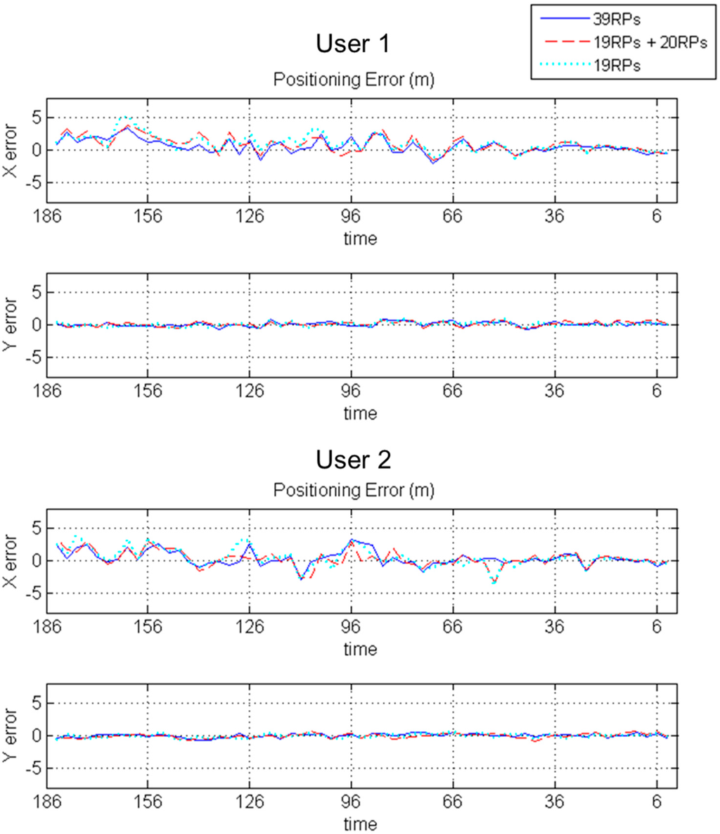 In this work, there are two users (User 1 and User 2) moving in the same path. The user path is divided into 61 points for the purpose of measurement. The distance between each point is 15.85 cm which is a half piece of a tile on the floor. The receiving time for the data at each user point is 10 s, and the average RSS value in the 4th to the 7th s is seen as the experimental measurement. The purpose is to capture packets from the greatest number of APs and to reduce any uncertain changes in RSS measurements. For the two users, the X direction and Y direction positioning errors are given in Figure 13. The units of positioning results are in meters. The width of the Y scale in the experimental field is 2.54 m, and that of the X scale is 10.13 m. The error trend with the 19 basic RPs and 20 Kriging interpolated points is similar to that with 39 basic RPs.