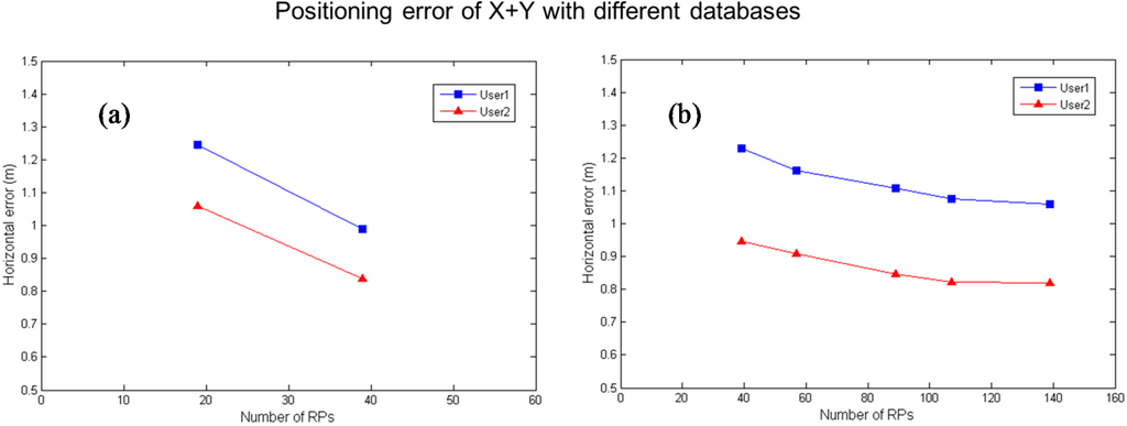The data for the positioning results are given in Table 4 and Table 5. Table 4 and Table 5 show the positioning errors and the standard deviations of positioning errors using the fingerprinting approach for User 1 and User 2, respectively. In Table 4 and Table 5, the upper row of Case 1 is the positioning result with 39 basic RPs (i.e., 39 real RSS data points), and the lower row of Case 1 is the positioning result with 19 basic RPs and 20 points with Kriging interpolation (i.e., only 19 real RSS data points). As noted earlier, the Case 1 is used to evaluate the real RSS data and the Kriging interpolated RSS data for both experiments with the same 39 RPs as shown in Figure 11. The X+Y error represents the distance error. Then, we compare the positioning results for five cases to the original results. The errors and the standard deviations for the five cases in the X direction are smaller than those of original one. The 57, 89, 107 and 139 RPs using the Kriging algorithm have better positioning performance in the X direction than that of the original one in our experimental range. For User 1, the positioning performance is improved up to 15.5% of the error in the X direction positioning results and up to 14.9% of the error in the horizontal positioning results. For User 2, the positioning performance is improved up to 22.7% of the error in the X direction positioning results and up to 20.9% of the error in the horizontal positioning results. In the Y direction, the improvement in the results is not significant due to the fact that the X scale is 3.75 times larger than the Y scale in the experimental field. Both users exhibit similar performance. As a result, the Kriging algorithm can be applied to extend the RSS database, and the Kriging interpolation points can be used to enhance the positioning performance.